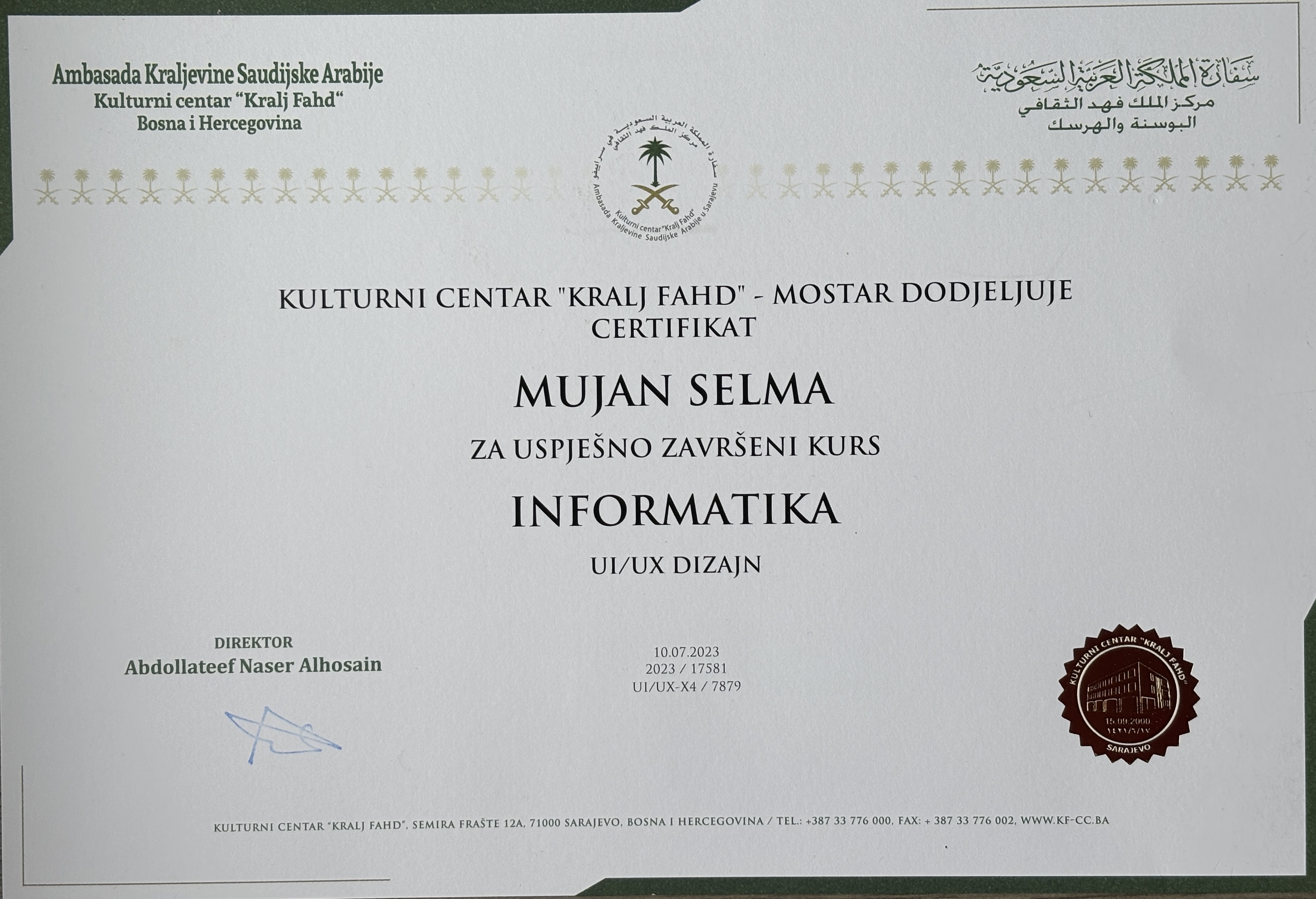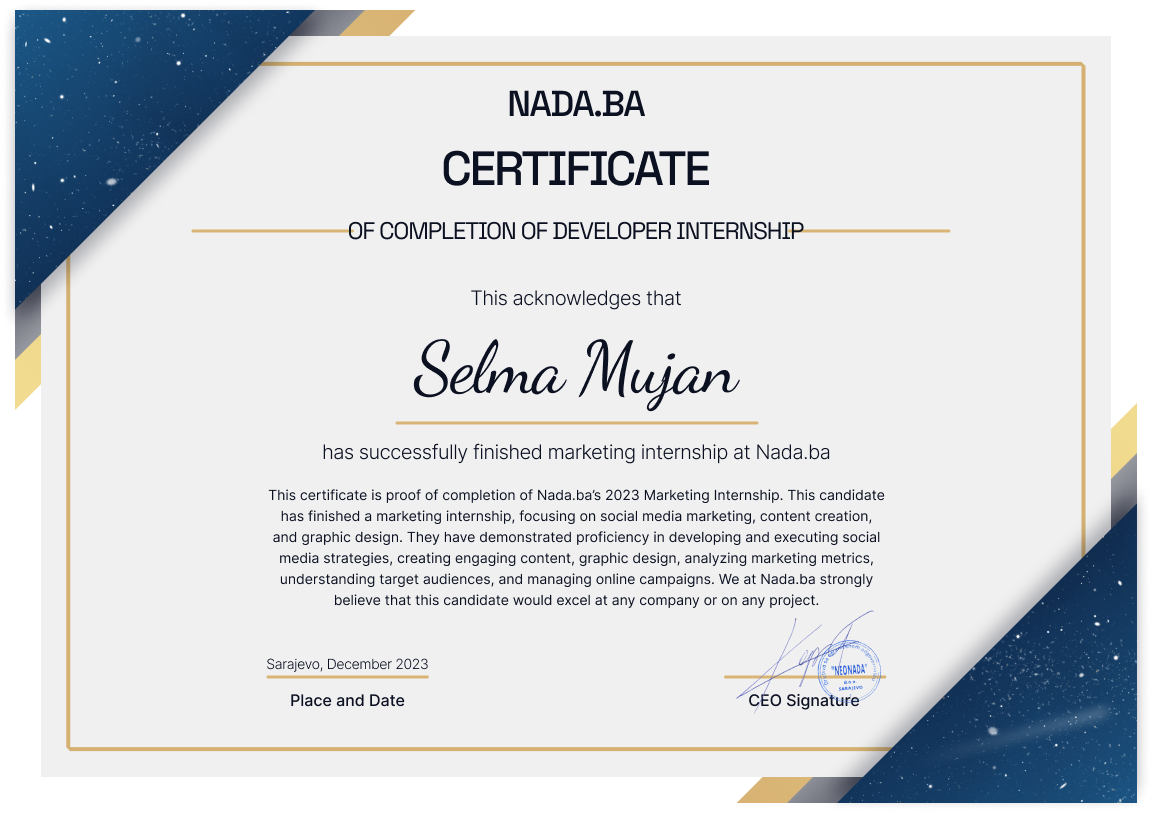 This is the certificate for completing a multi-month internship in marketing at Nada.ba. During this internship, I gained hands-on experience in social media marketing, content creation, graphic design, and analyzing marketing metrics. It was an invaluable opportunity to apply my skills in a professional setting and further develop my expertise in digital marketing.