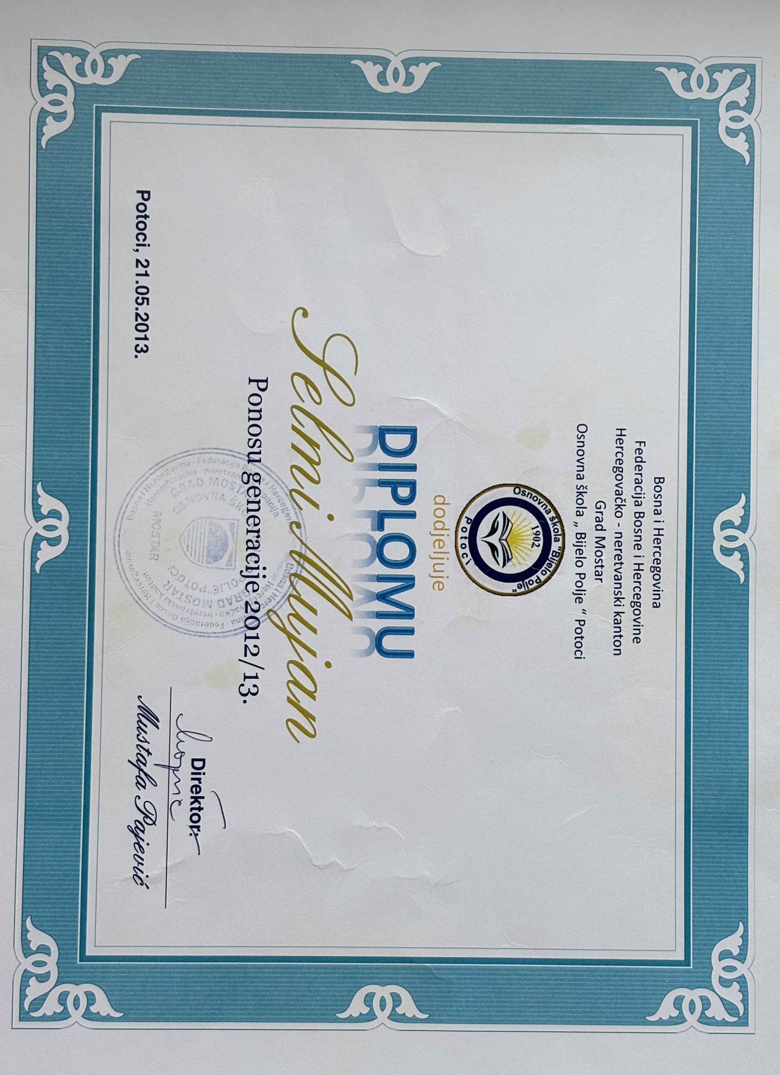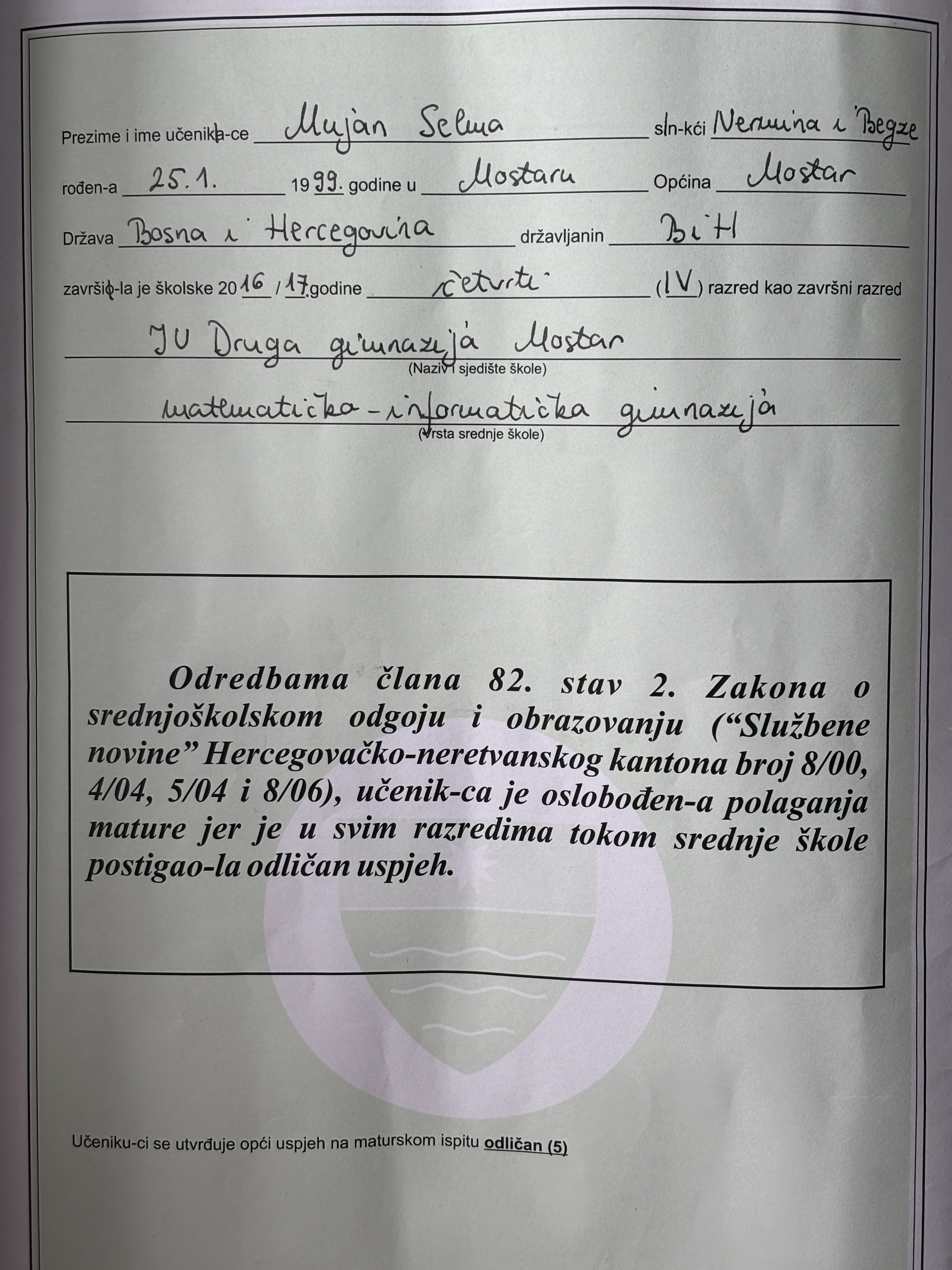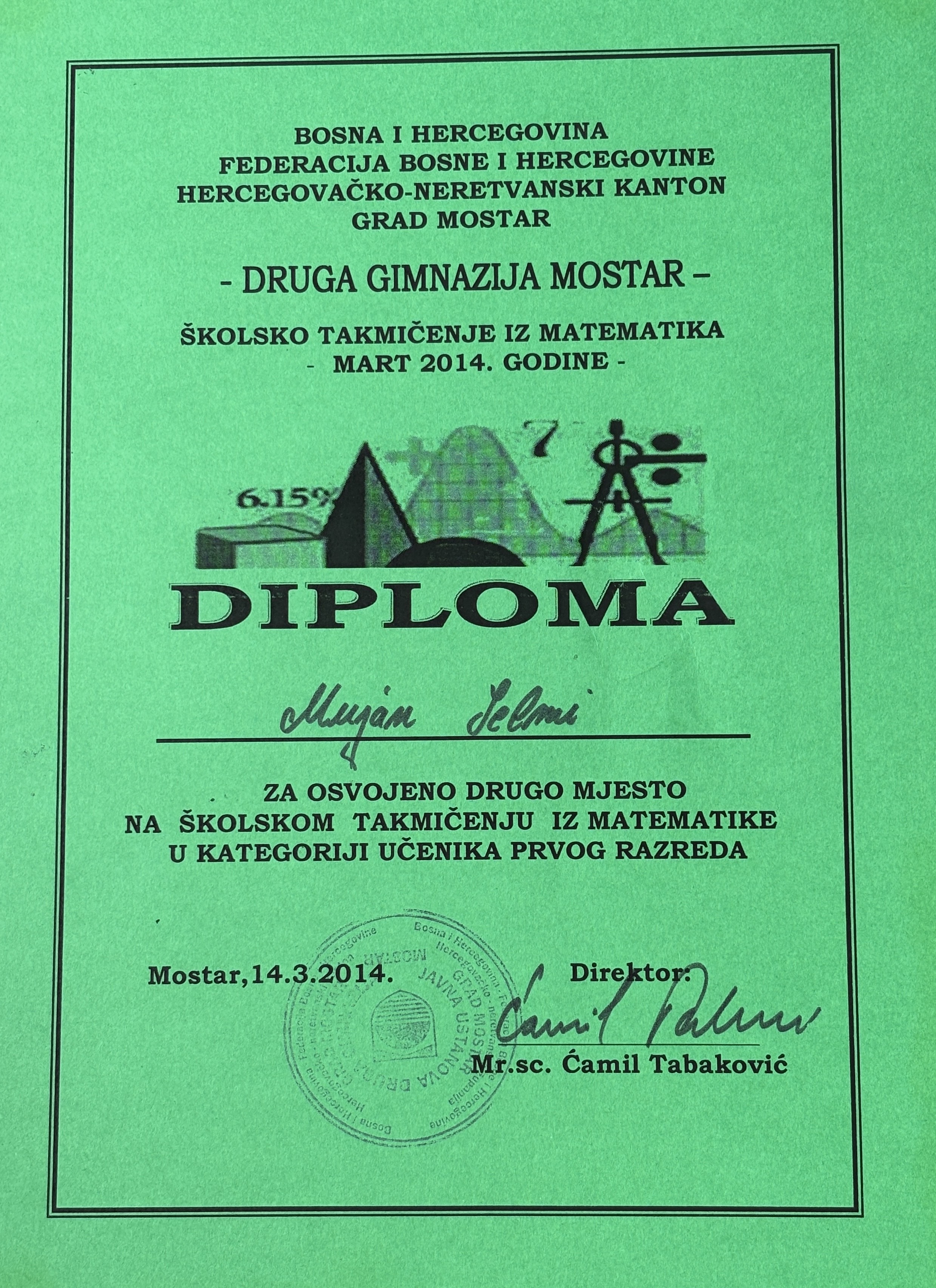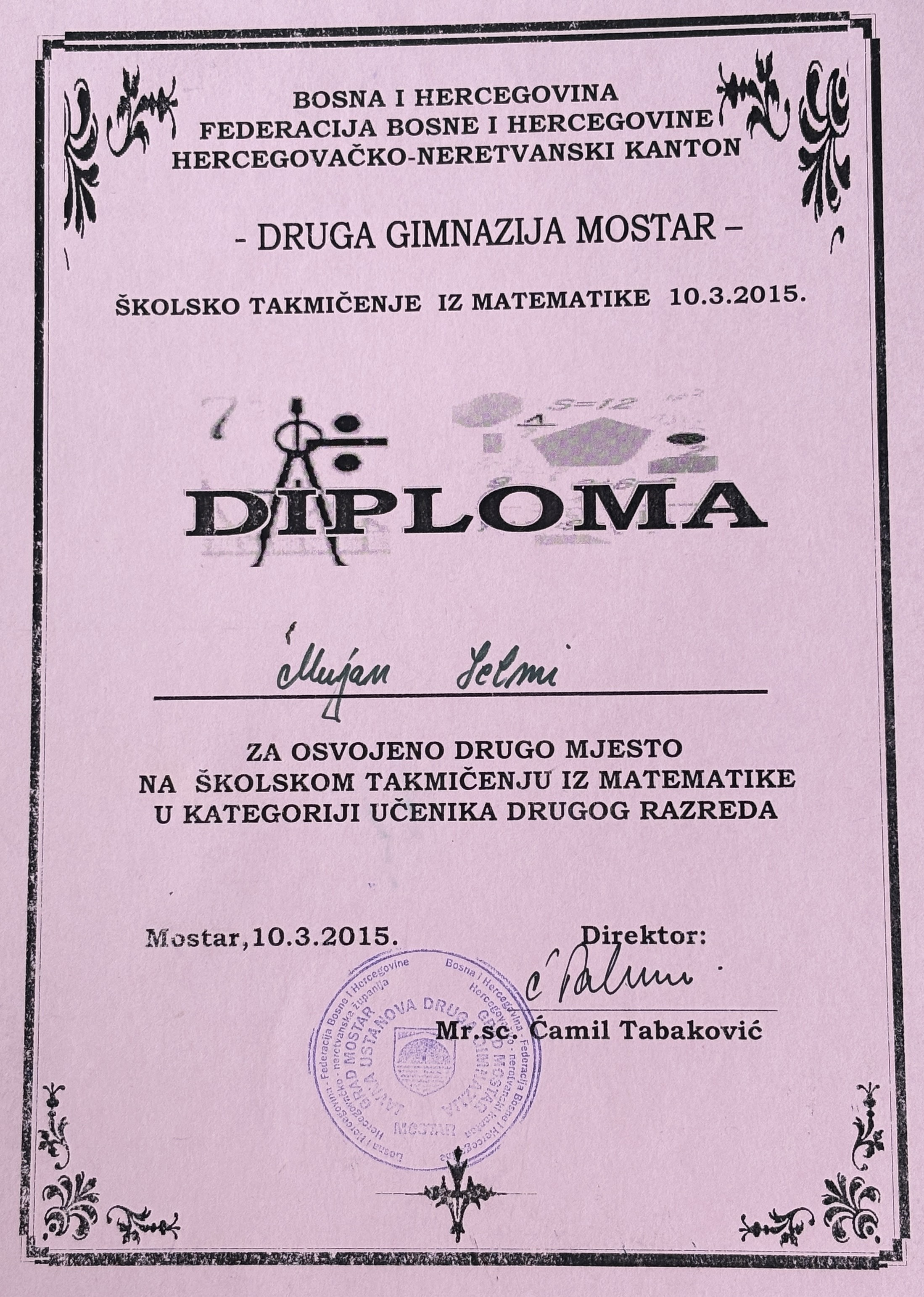 This is my high school diploma, earned from the Mathematical-IT track at the Second High School in Mostar. This diploma reflects my strong foundation in mathematics and computer science, preparing me for further academic and professional growth in the field of Information Technology.