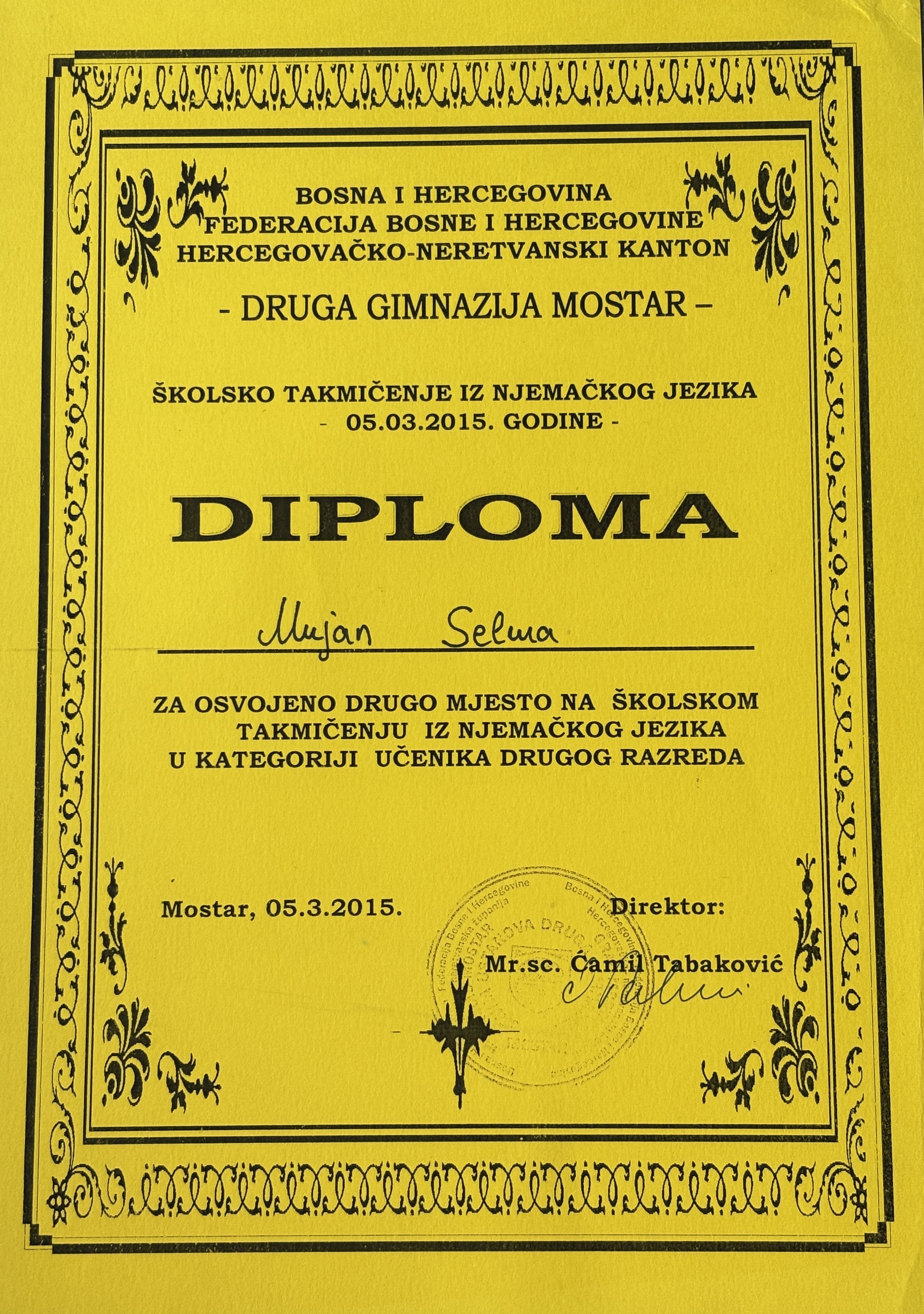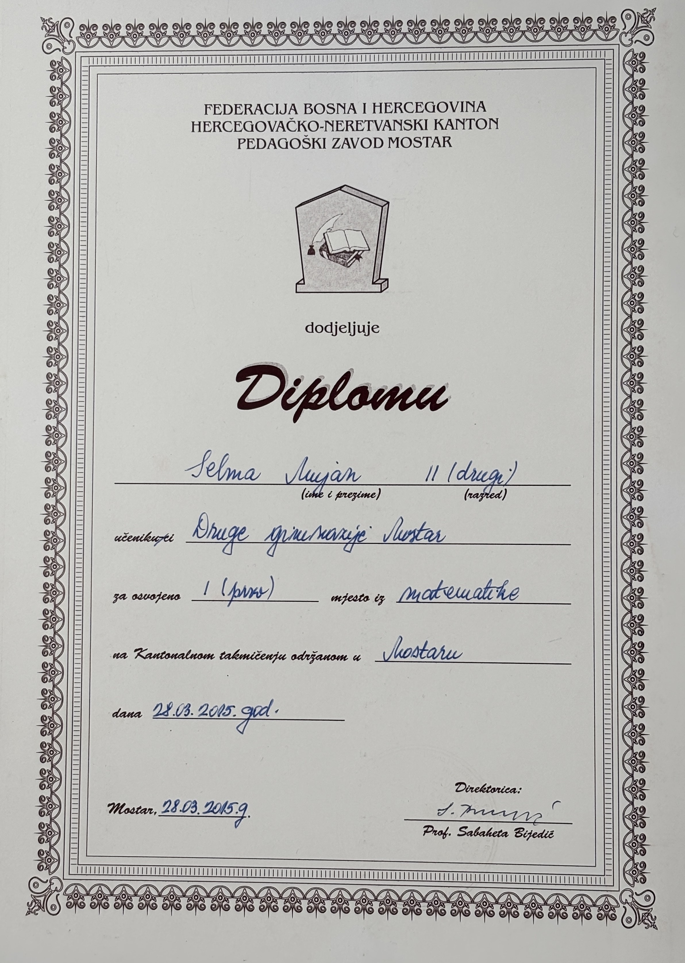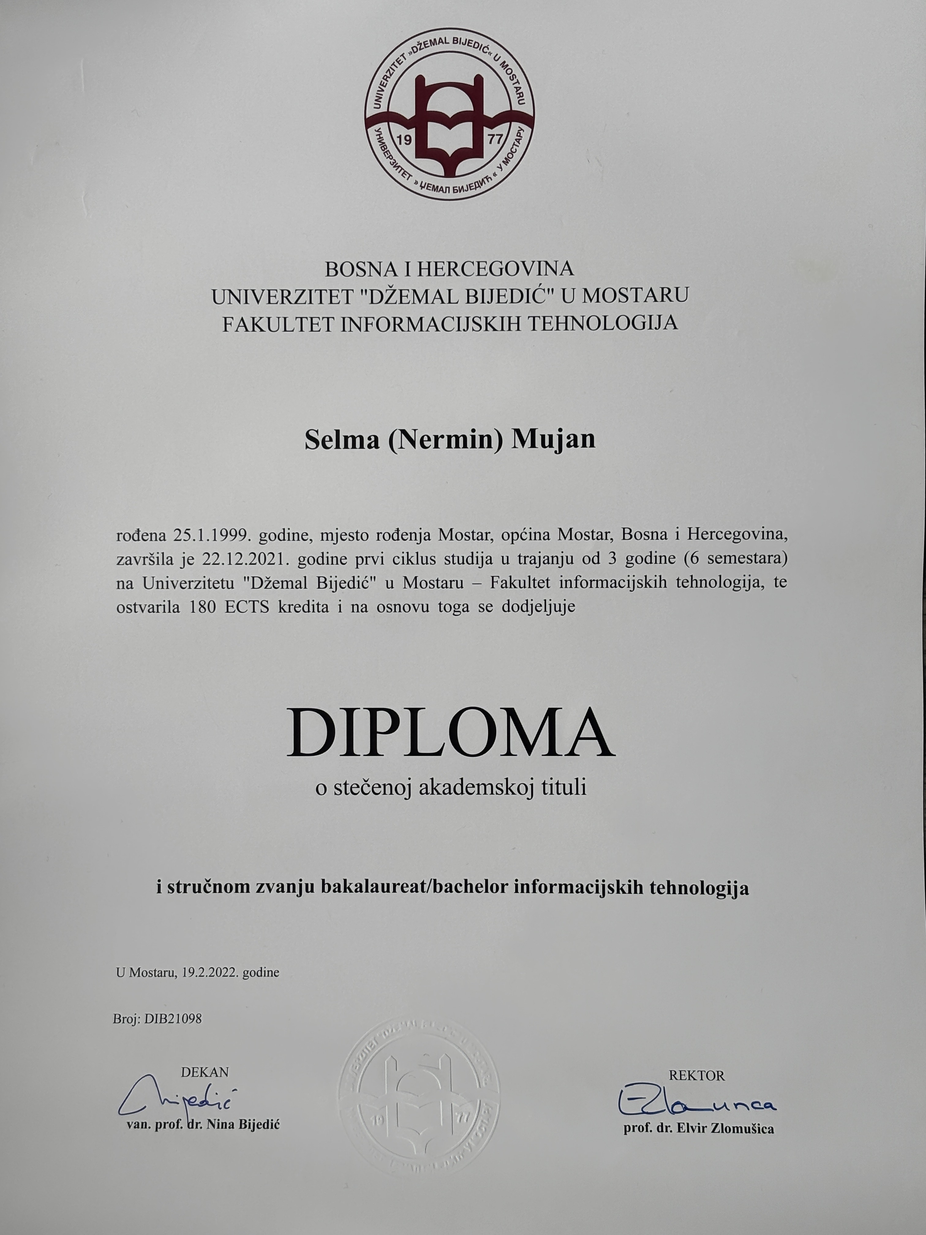 This is my high school diploma, earned from the Mathematical-IT track at the Second High School in Mostar. This diploma reflects my strong foundation in mathematics and computer science, preparing me for further academic and professional growth in the field of Information Technology.