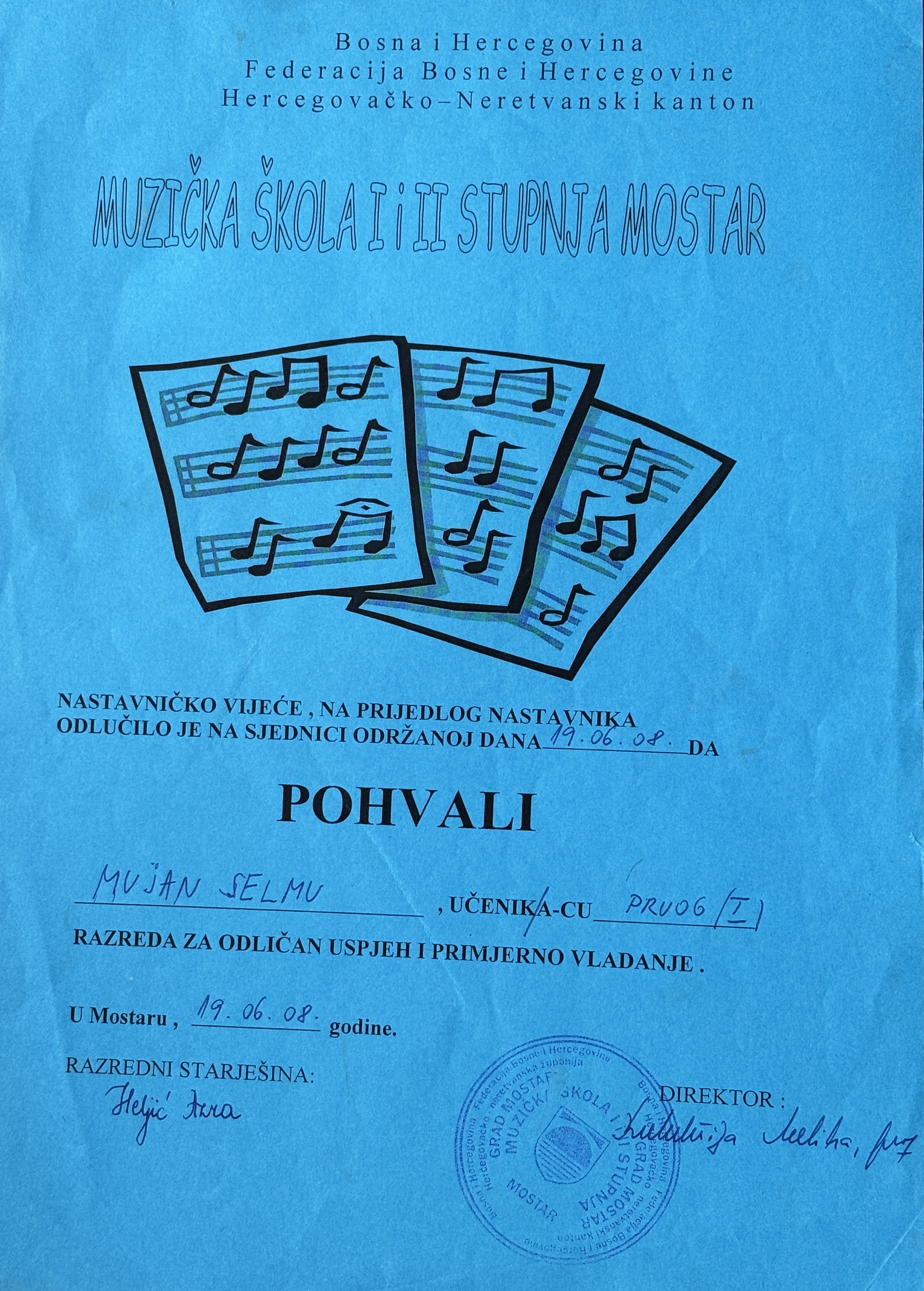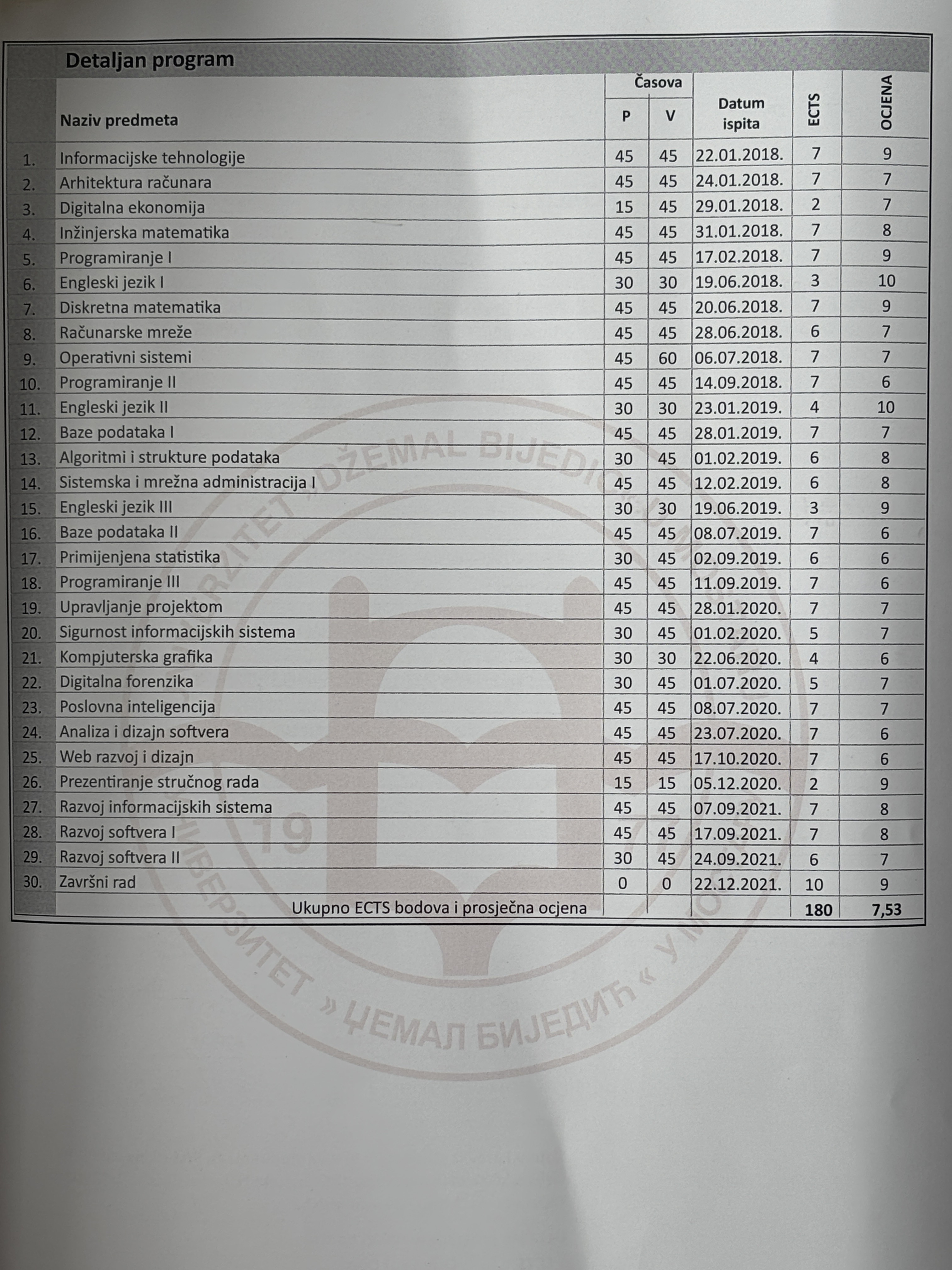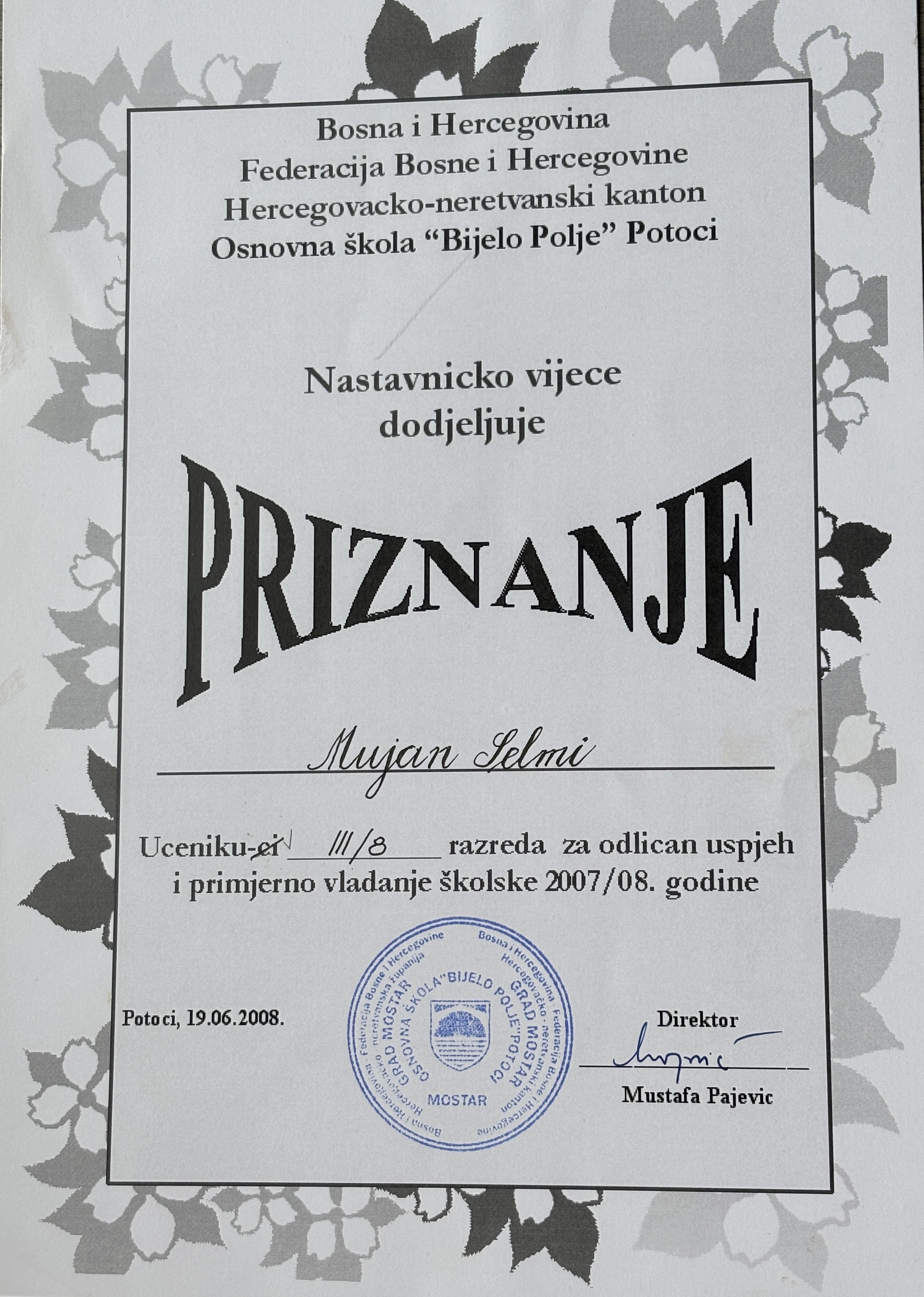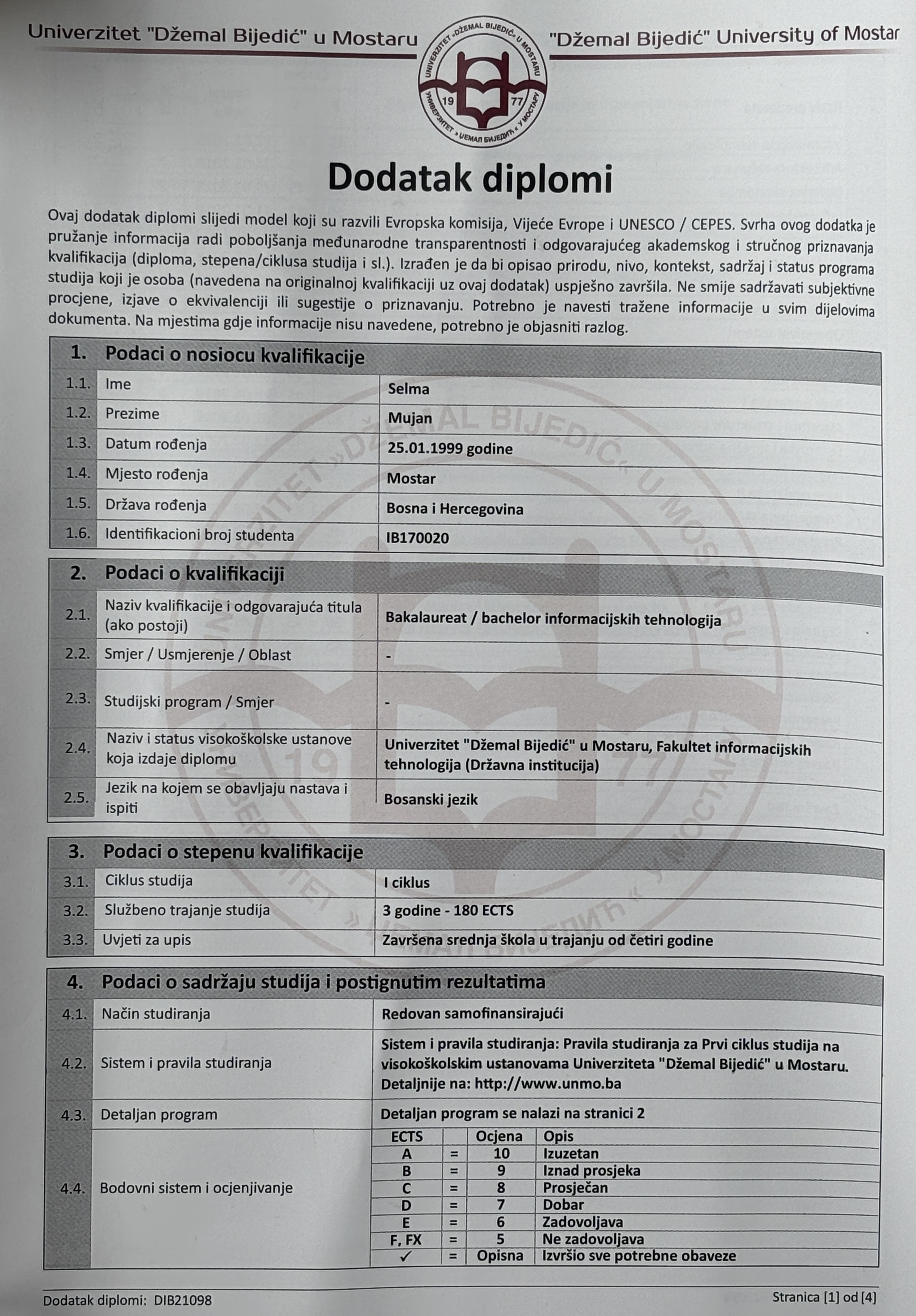 This is my high school diploma, earned from the Mathematical-IT track at the Second High School in Mostar. This diploma reflects my strong foundation in mathematics and computer science, preparing me for further academic and professional growth in the field of Information Technology.