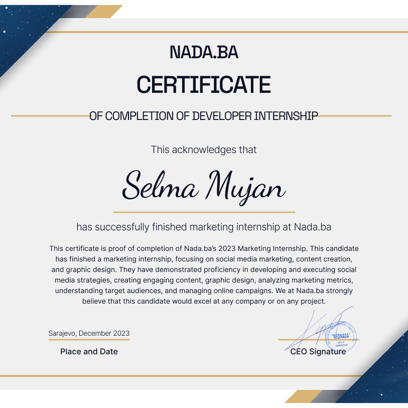 I’ve earned certificates in UX/UI Design, QA Manual Testing, and JavaScript, along with a Marketing Internship Certificate from nada.ba and an IT Support Bootcamp Certificate from NSoft — all of which have helped shape my multidisciplinary approach to tech and design.