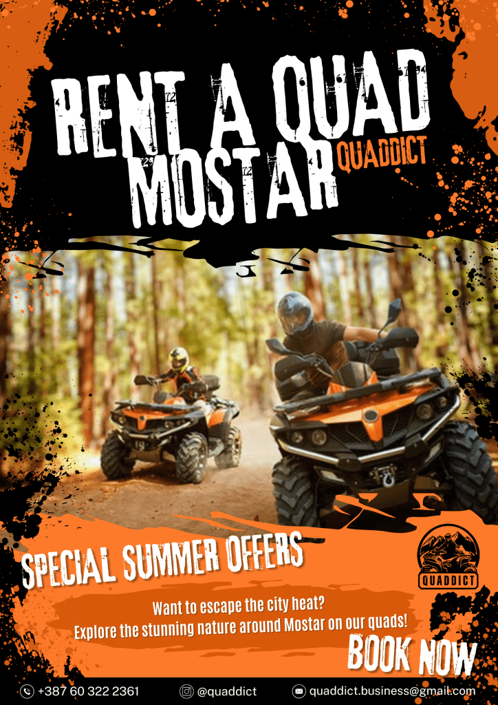 For Quaddict, I created promotional flyers and content that resonated strongly with the target audience. The materials I produced played a key role in driving customer engagement and ultimately helped bring in a significant number of new customers. The promotional efforts were well-received and contributed to growing the brand's presence and attracting more people interested in renting quads in the Mostar area.