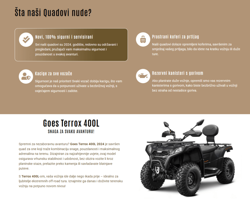 The design also features earthy, off-road colors, primarily shades of brown, reflecting the rugged nature of the quad bikes intended for off-road trails. In the background, I included a mountain, symbolizing the type of terrain for which the quads are meant, further reinforcing the brand's adventure spirit. To emphasize that the quads are 100% legit and properly registered, I included the rental name on a license plate.